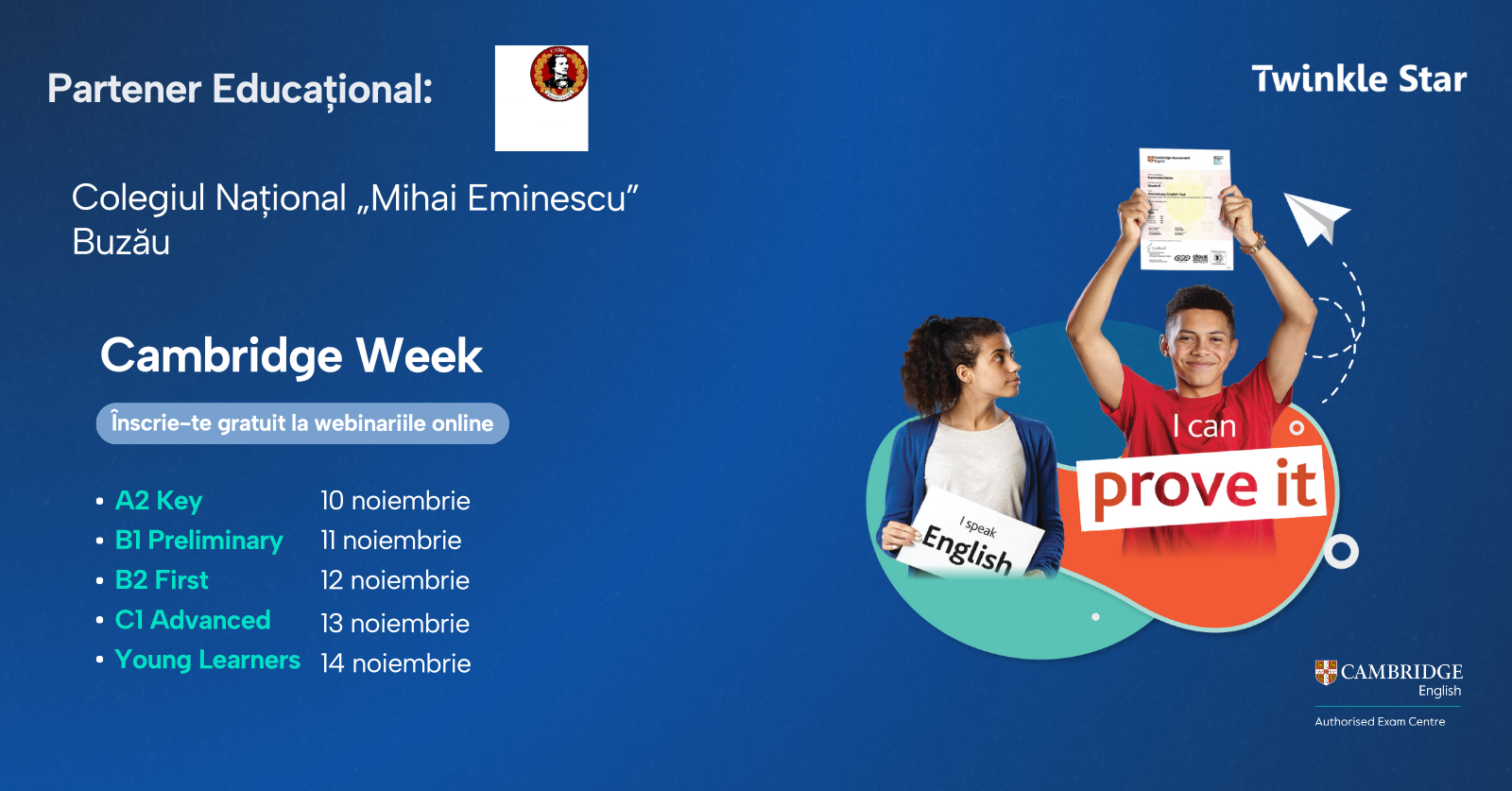 Suntem încântați să anunțăm parteneriatul nostru cu Twinkle Star – Cambridge English Educational Partner, în cadrul evenimentului CAMBRIDGE WEEK, o serie de webinarii interactive și gratuite, dedicate elevilor, părinților și profesorilor interesați de examenele Cambridge English.@Twinkle Star